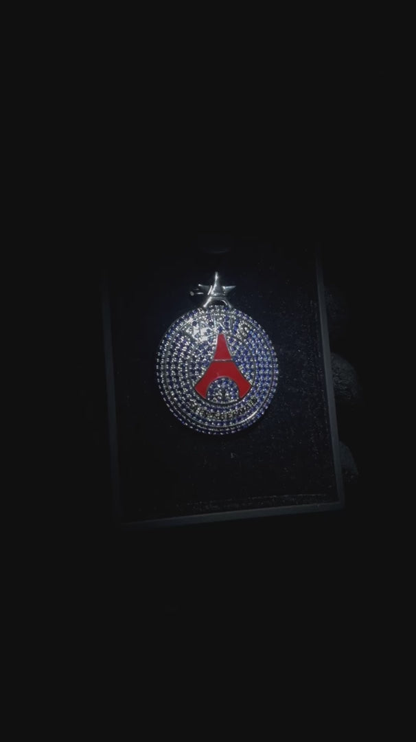 Son design circulaire met en valeur une Tour Eiffel rouge stylisée, entourée de pierres bleues étincelantes, symbole de fierté et de victoire.
